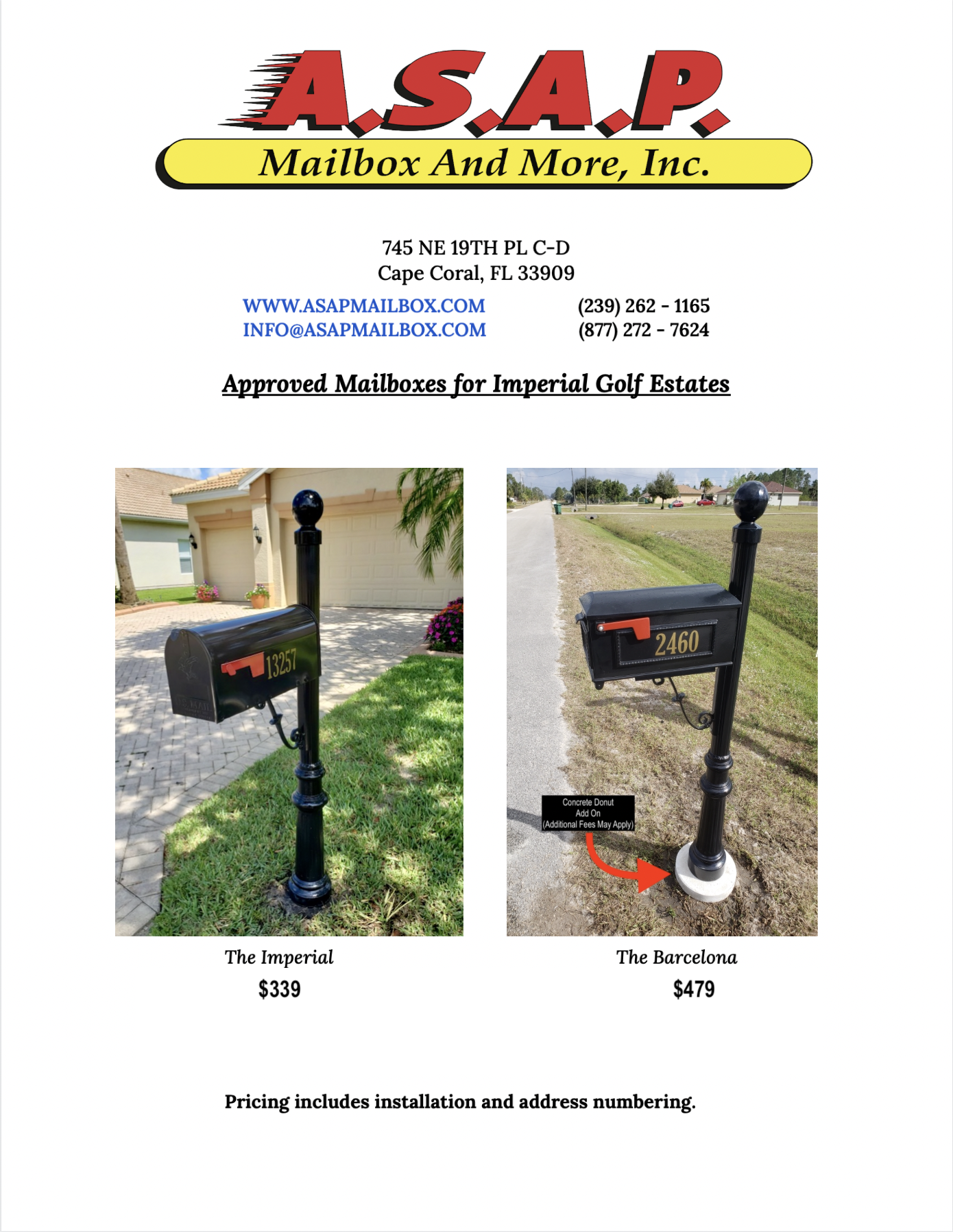 A.S.A.P. Mailbox Repair and/or Replacement Price List